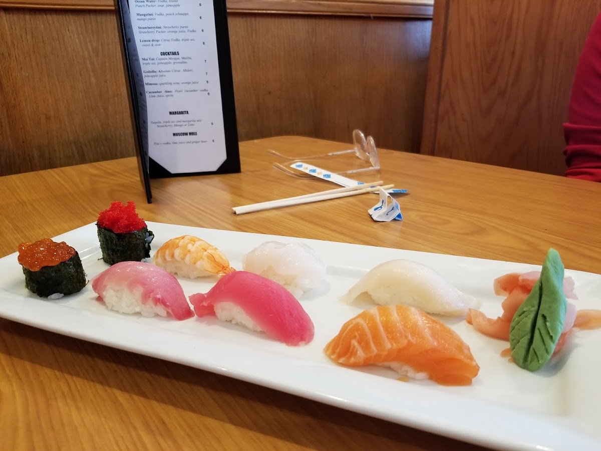 Eel, avocado, crab topped with tuna, white tuna, red snapper, salmon, eel sauce
