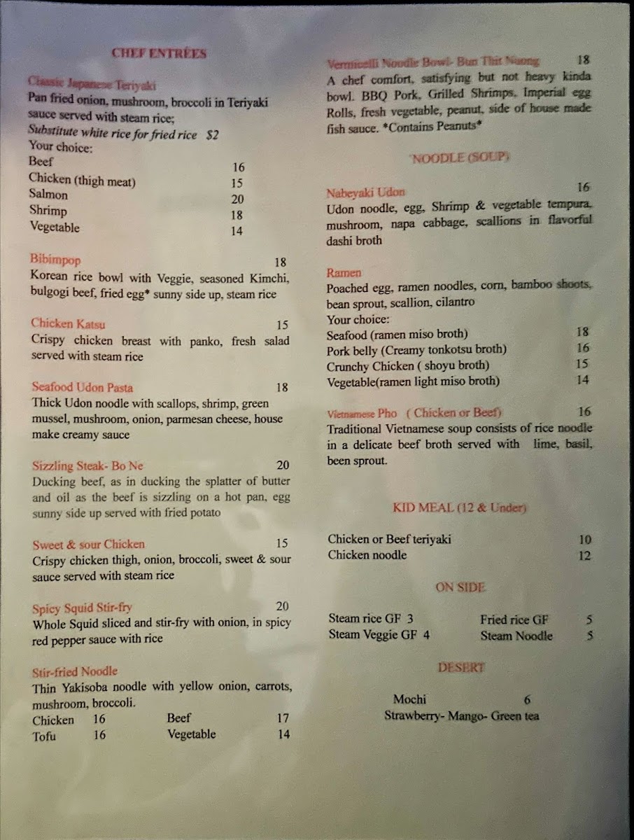 Thin Yakisoba noodle with sweet onion, carrots, mushroom, broccoli, green onion and house soba sauce.
